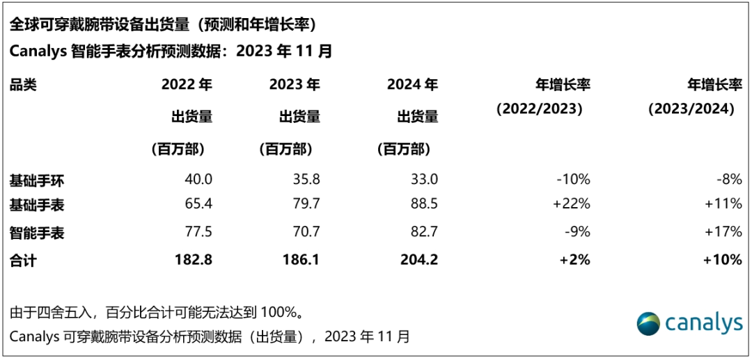 據(jù)調(diào)研機(jī)構(gòu)Canalys數(shù)據(jù),全球可穿戴腕帶設(shè)備分析預(yù)測數(shù)據(jù)顯示,2023年該品類的總銷量為1.86億臺,增長2%。