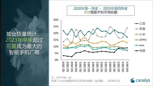 2023 年全年,全球智能手機總出貨量為 11 億部,同比下降 4%。蘋果首次略超三星,成為2023年度出貨量最高的廠商,不過兩者的市場份額均為 20%。小米、OPPO 和 傳音分別占據(jù) 13%、9% 和 8%的市場份額。