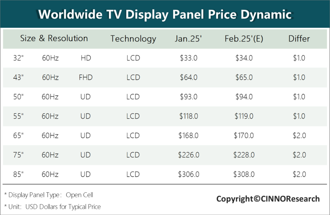 進(jìn)入2025年一季度,春節(jié)期間雖為傳統(tǒng)淡季,但國(guó)內(nèi)“以舊換新”補(bǔ)貼政策的延續(xù)為新一年的家電市場(chǎng)注入了一劑“強(qiáng)心針”,TV市場(chǎng)需求短期內(nèi)依舊強(qiáng)勁,促使1月65”及以上大尺寸面板價(jià)格持續(xù)上漲。進(jìn)入今年2月,美對(duì)華和墨西哥加征關(guān)稅政策的落地以及推遲或?qū)⒓铀俨糠制放茝S后續(xù)的備貨計(jì)劃。在國(guó)內(nèi)外備貨需求高漲的情況下,面板廠雖小幅提升LCD TV高世代產(chǎn)線稼動(dòng)率,但供應(yīng)仍然偏緊,在大尺寸持續(xù)上漲的前提下有望拉動(dòng)中小尺寸面板價(jià)格聯(lián)動(dòng)上漲。