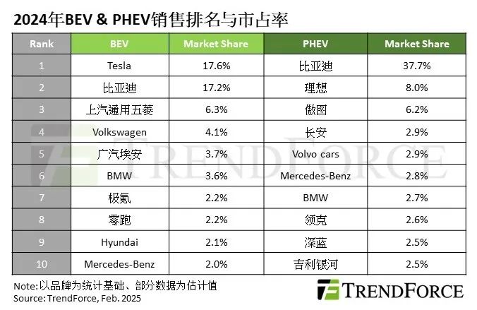 PHEV部分,第一名的比亞迪品牌市占率約38%,若加計集團內其他品牌則超過40%。第二至四名分別為理想、傲圖和長安(含啟源),其中,傲圖因問界M9帶動其總銷量大幅提升,進入年度市占前十大榜單。BMW的PHEV銷量較去年小幅下降3%,位居第七名,其BEV和PHEV的銷量差距持續擴大。吉利集團的自主品牌領克和吉利銀河也是新上榜,分別為第八和第十名。吉利集團2024年整合旗下品牌,包括幾何汽車并入吉利銀河,領克和極氪合并為極氪科技集團,但仍維持領克和極氪雙品牌發展。