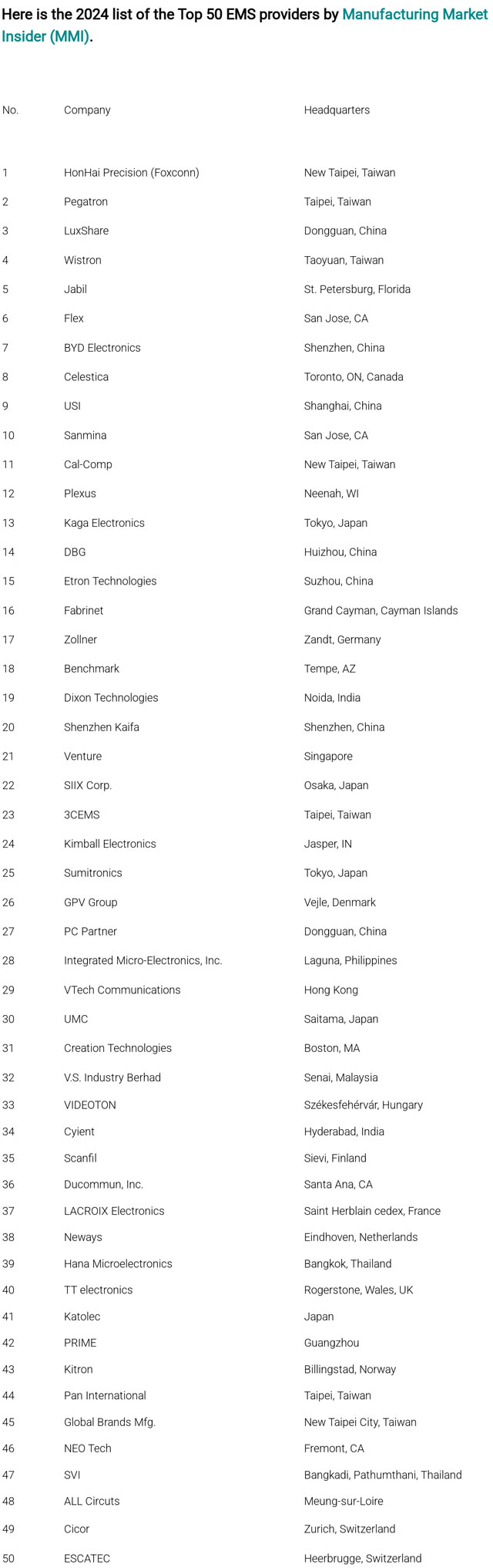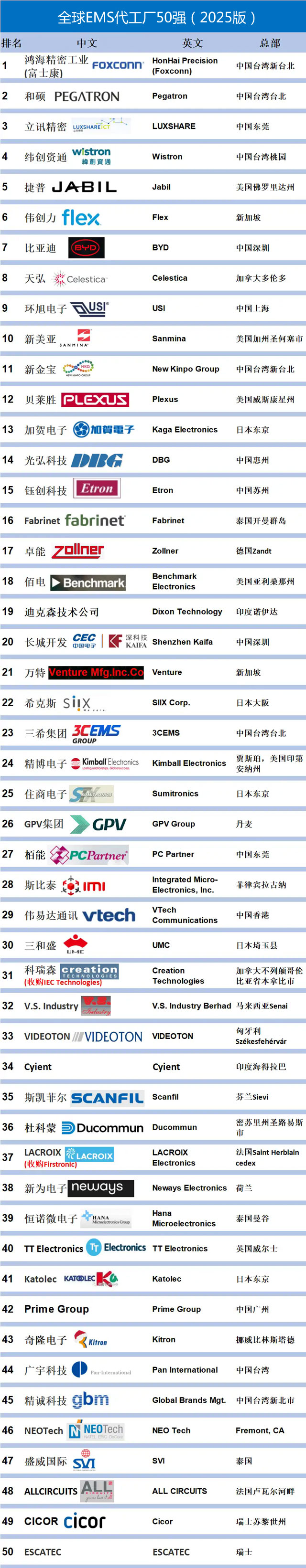 知名電子制造服務研究機構MMI經過對100余家最大的EMS公司年度調查,于2025年4月公布了2024年全球最大EMS服務商50強名單。
