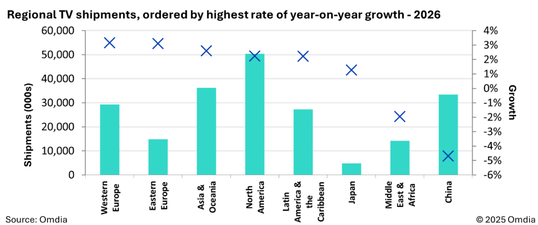 預計2026年增長最快的市場將出現在歐洲,其中西歐電視出貨量預計增長3.2%,東歐出貨量預計增長3.1%。作為賽事舉辦地的北美市場也有望實現穩健增長,增幅約為2.2%。
