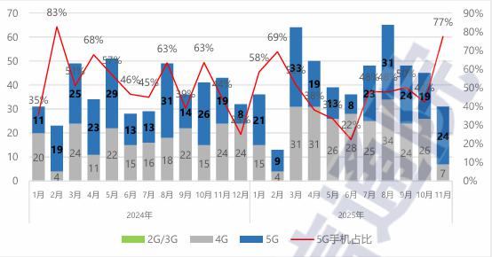 2025 年 11 月,國內手機上市新機型 31 款,同比下降 27.9%,其中 5G 手機 24 款,同比增長 26.3%,占同期手機上市新機型數量的 77.4%。