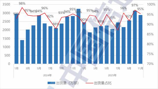 2025 年 11 月,智能手機出貨量 2875.1 萬部,同比增長 2.0%,占同期手機出貨量的 95.3%;智能手機上市新機型 24 款,同比下降 7.7%,占同期手機上市新機型數量的 77.4%。