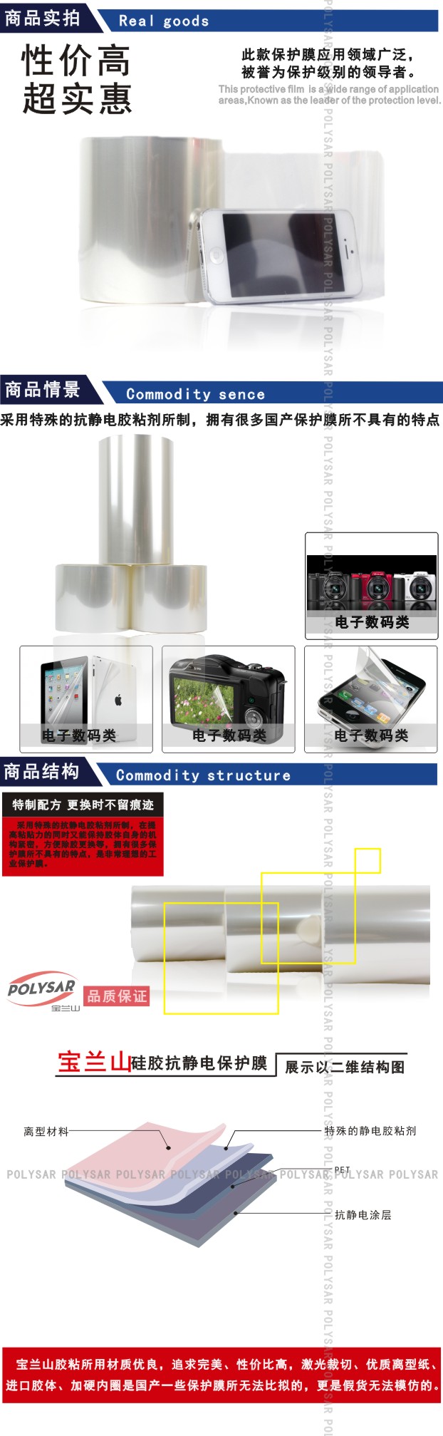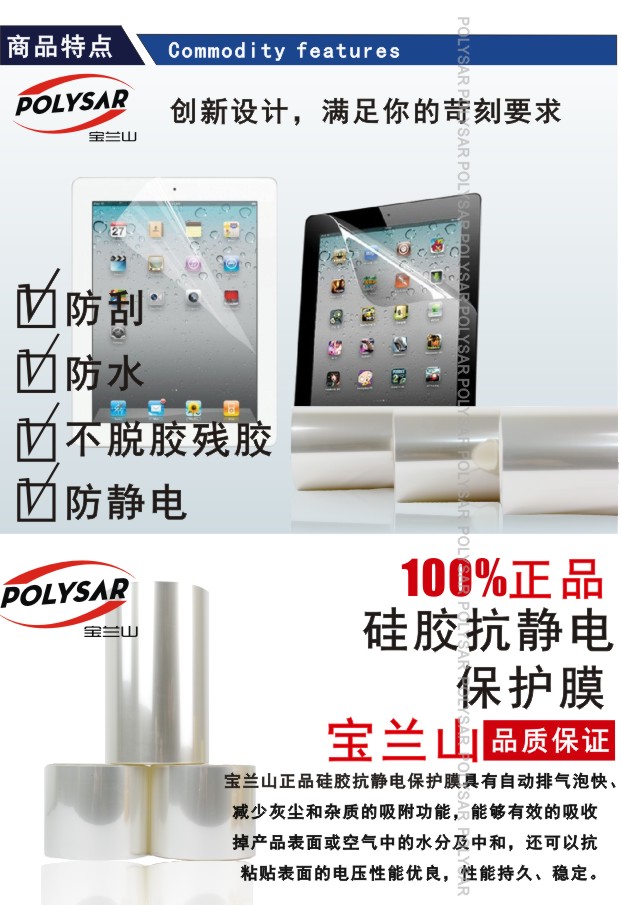 是**款由基材抗靜電涂層背面涂以硅膠的保護(hù)膜,具有自動(dòng)排氣泡快、減少灰塵和雜質(zhì)的吸附功能,能夠有效的吸收掉產(chǎn)品表面或空氣中的水分及中和,還可以抗粘貼表面的電壓性能優(yōu)良,性能持久、穩(wěn)定。