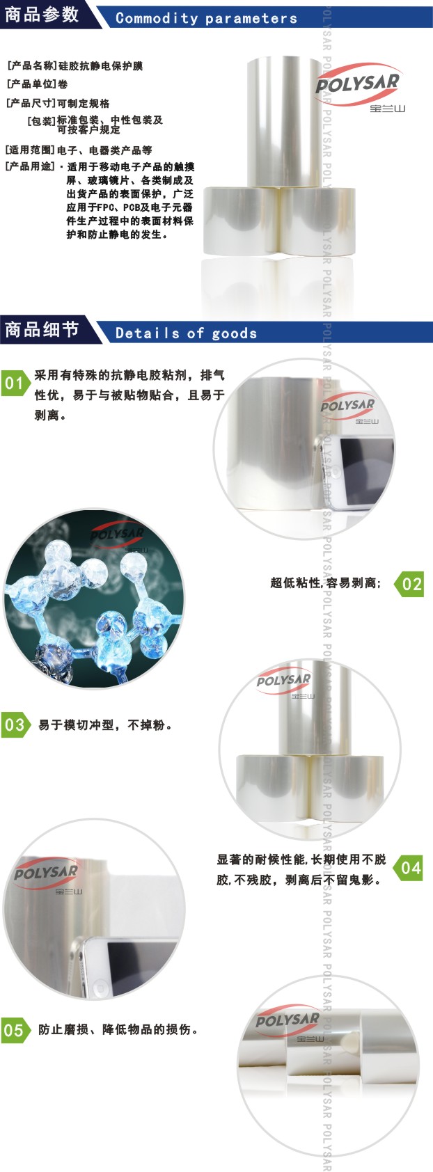 適用于移動(dòng)電子產(chǎn)品的觸摸屏、玻璃鏡片、各類制程及出貨產(chǎn)品的表面保護(hù),廣泛應(yīng)用于FPC、PCB及電子元器件生產(chǎn)過(guò)程中的表面材料保護(hù)和防止靜電的發(fā)生。