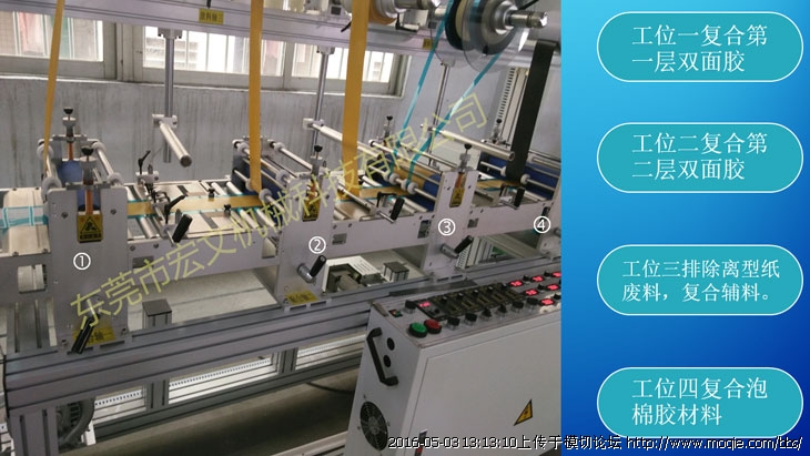 因產品結構的調整,原有三工位無法滿足生產要求,這里在復合的時候使用四工位貼合機。如果復合材料較多,可使用多臺貼合機組合使用。