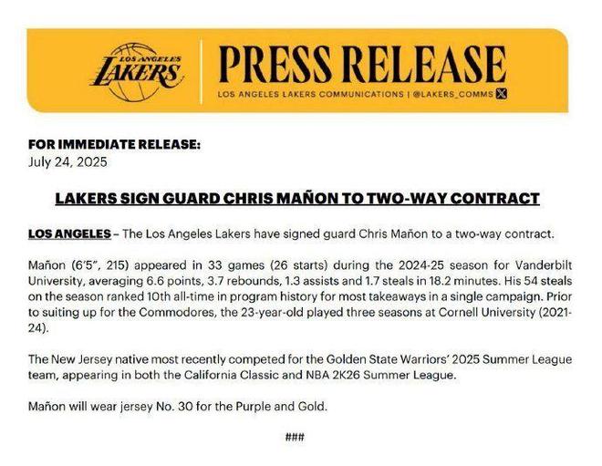 馬農今夏參加NBA選秀成為落選秀,隨后代表勇士出戰NBA夏季聯賽,場均貢獻9分4.3籃板1.9助攻1.6搶斷1.4蓋帽,如今以一份雙向合同簽約湖人。